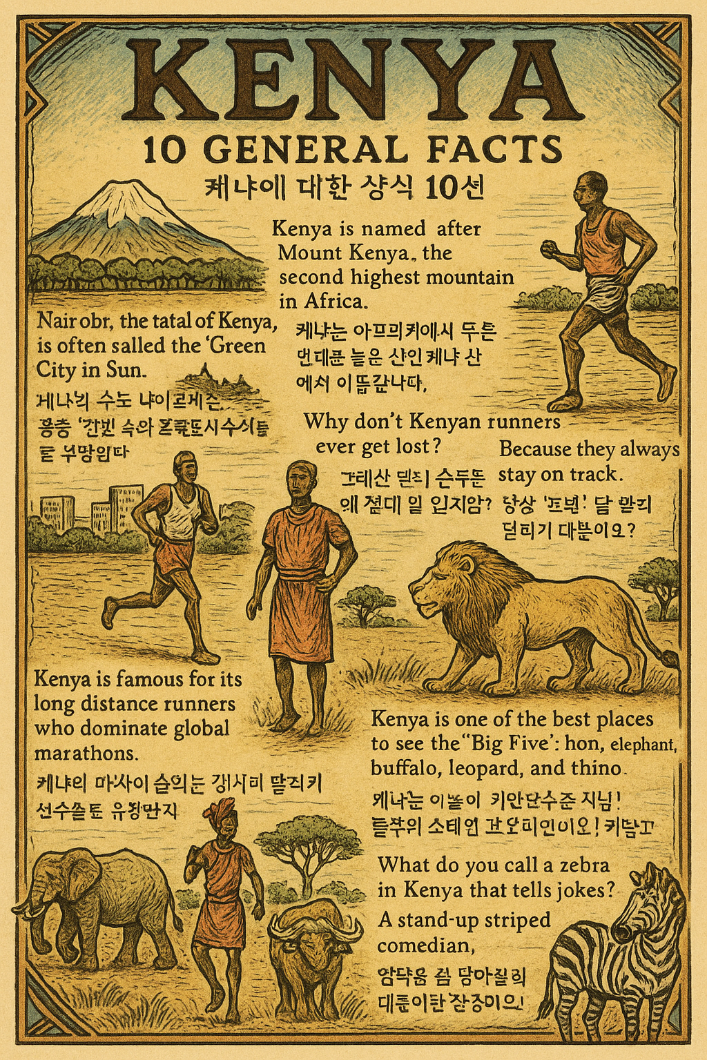 물론입니다! 아래는 **케냐(Kenya)**를 주제로 한 유머 10선입니다. 각 유머에는 영문 원문, 간단한 영어 해설, 한국어 번역, 한국어 해설이 포함되어 있습니다. 현지 문화, 동물, 사파리, 커피, 마라톤 등 케냐의 대표적인 특징을 유머에 반영했습니다.🇰🇪 Kenya Humor Top 10(with English explanations and Korean translations)1.EN: Why don’t cheetahs ever get speeding tickets in Kenya?Because the police know they’re just built that way.Explanation: Refers to cheetahs’ natural speed and Kenya’s famous w..